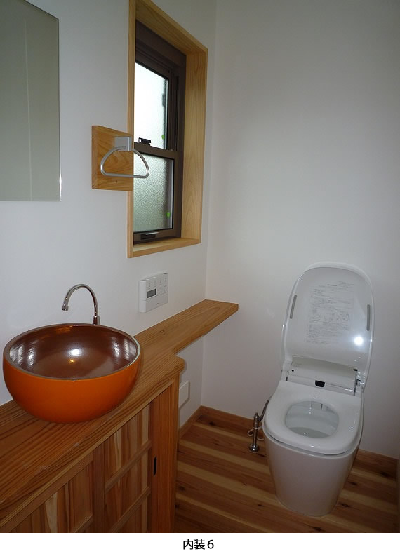 3㎝厚の杉のフローリングに自然塗料、スイス漆喰や総檜貼りの洗面所や大工さんの手作り収納や家具。